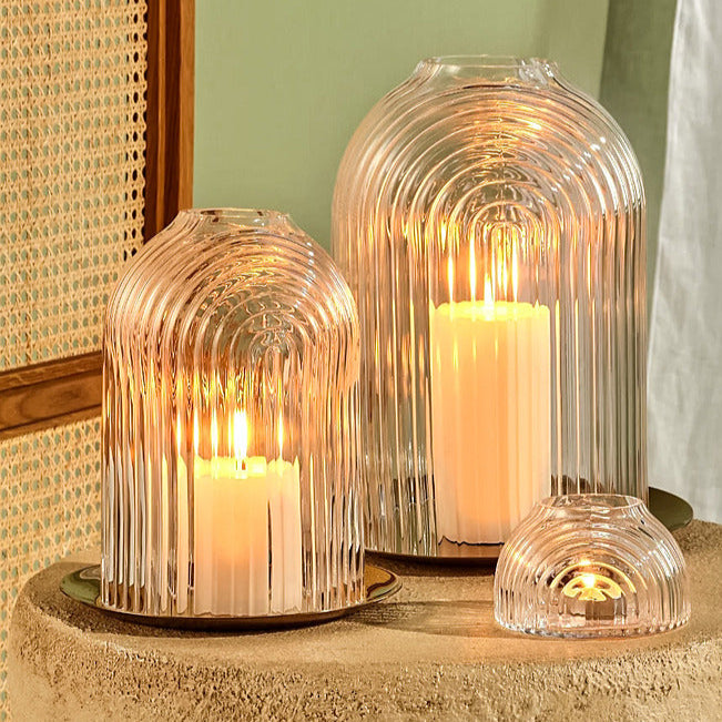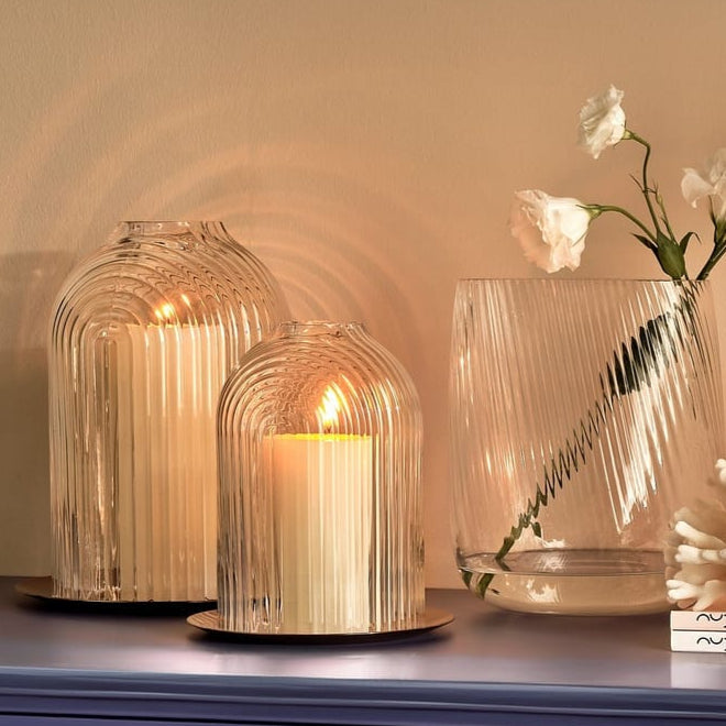 Perfect indoors or outside, the Ilo hurricane lamp features a hand-engraved ripple dome which rests on top of a light-reflective copper base. Works perfectly with our large Belgian Pillar Candles.