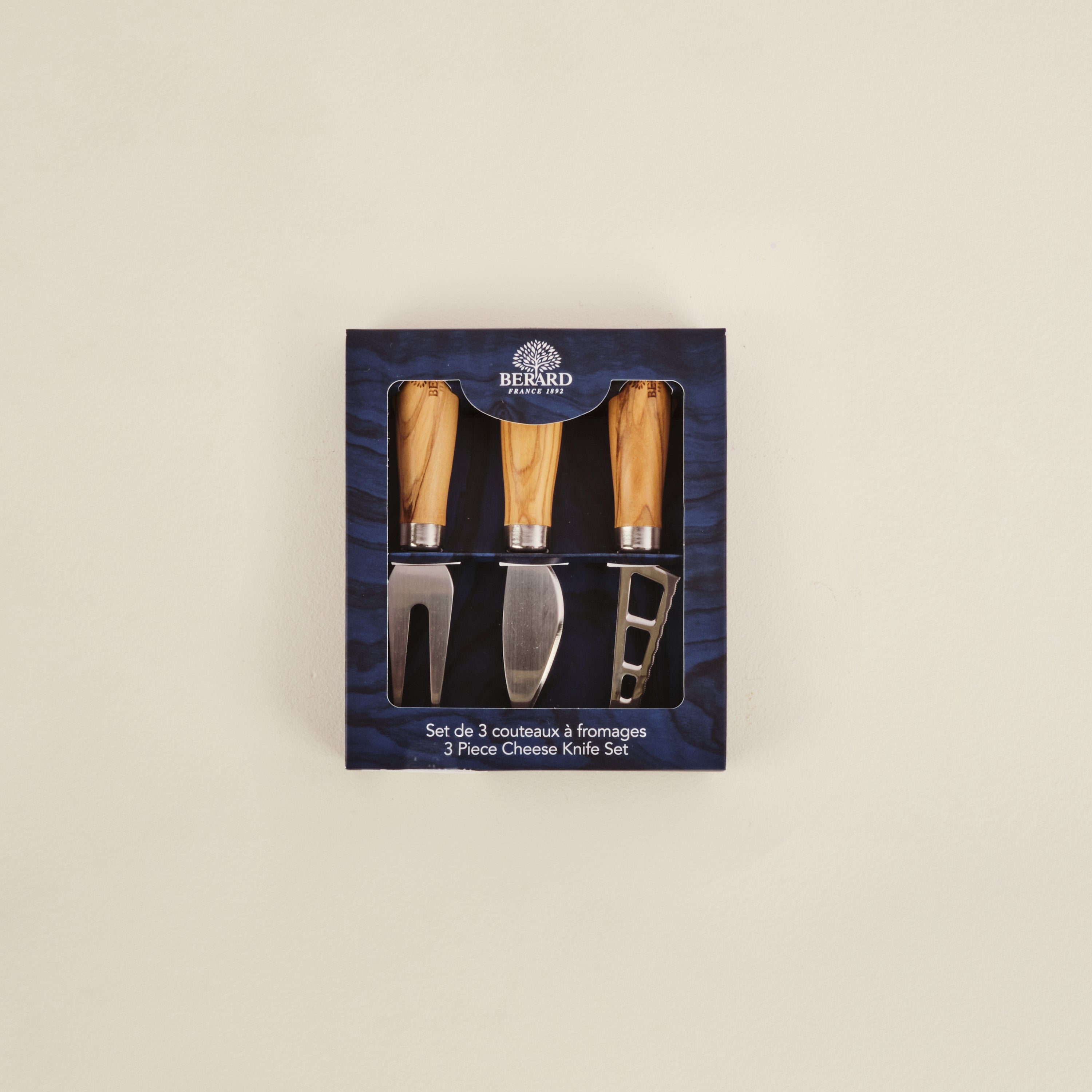 Crafted in France from sustainably sourced olivewood, this cheese set features a rich grain and natural variations in the wood so that each piece is unique. With stainless steel blades and smooth olivewood handles, it’s a timeless addition to any cheese board.