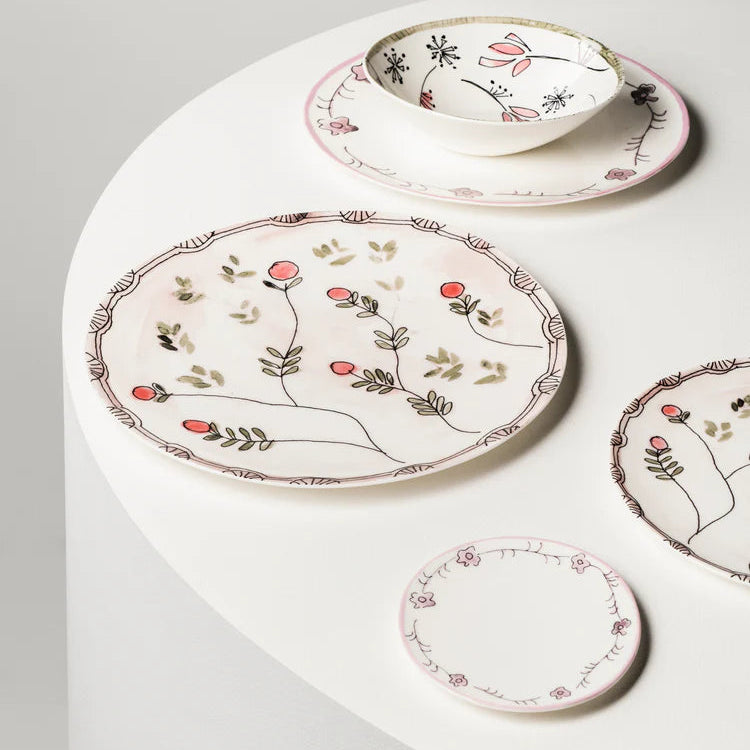 This plate features hand-painted anemones, bringing a sense of botanical artistry and life to the porcelain. Finished with a protective glaze, this piece is as practical as it is poetic.